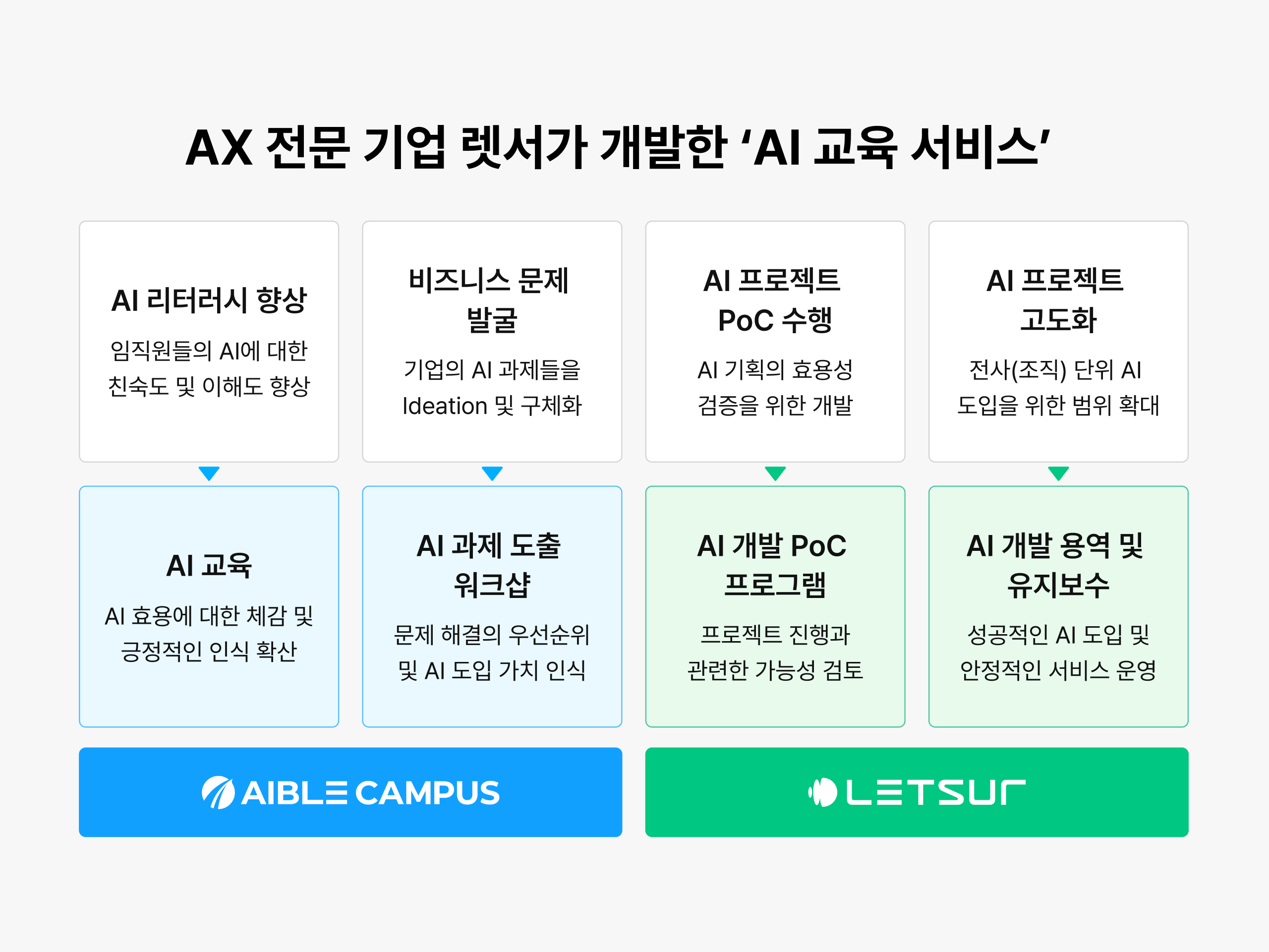 렛서는 기업의 AI 전환을 전 과정에서 지원하는 비즈니스 파트너입니다. 단순히 기술을 공급하는 수준을 넘어, 교육·컨설팅·개발·운영관리까지 통합된 서비스를 제공하여 조직이 AI를 안정적으로 내재화할 수 있도록 돕습니다. 특히 자체 AI 운영관리 플랫폼 ‘스테이엑스(Staix)’를 기반으로, 복잡한 모델 관리와 배포, 보안, 비용 통제를 효율적으로 지원하며, 대규모 API 환경에서도 안정성을 보장합니다. 또한 AI 교육 브랜드 ‘에이블캠퍼스’를 통해 임직원의 데이터 리터러시와 AI 활용 능력을 강화하고, 맞춤형 프로젝트 컨설팅으로 기업의 실제 비즈니스 문제를 해결합니다. 렛서는 엔터프라이즈 고객을 중심으로 신뢰성과 전문성을 확보해왔으며, 고객사의 성장이 곧 우리의 성장이라는 철학 아래 장기적 파트너십을 구축해 나가고 있습니다. 우리는 기술을 넘어, 기업이 실질적인 성과와 가치를 창출할 수 있도록 함께합니다.