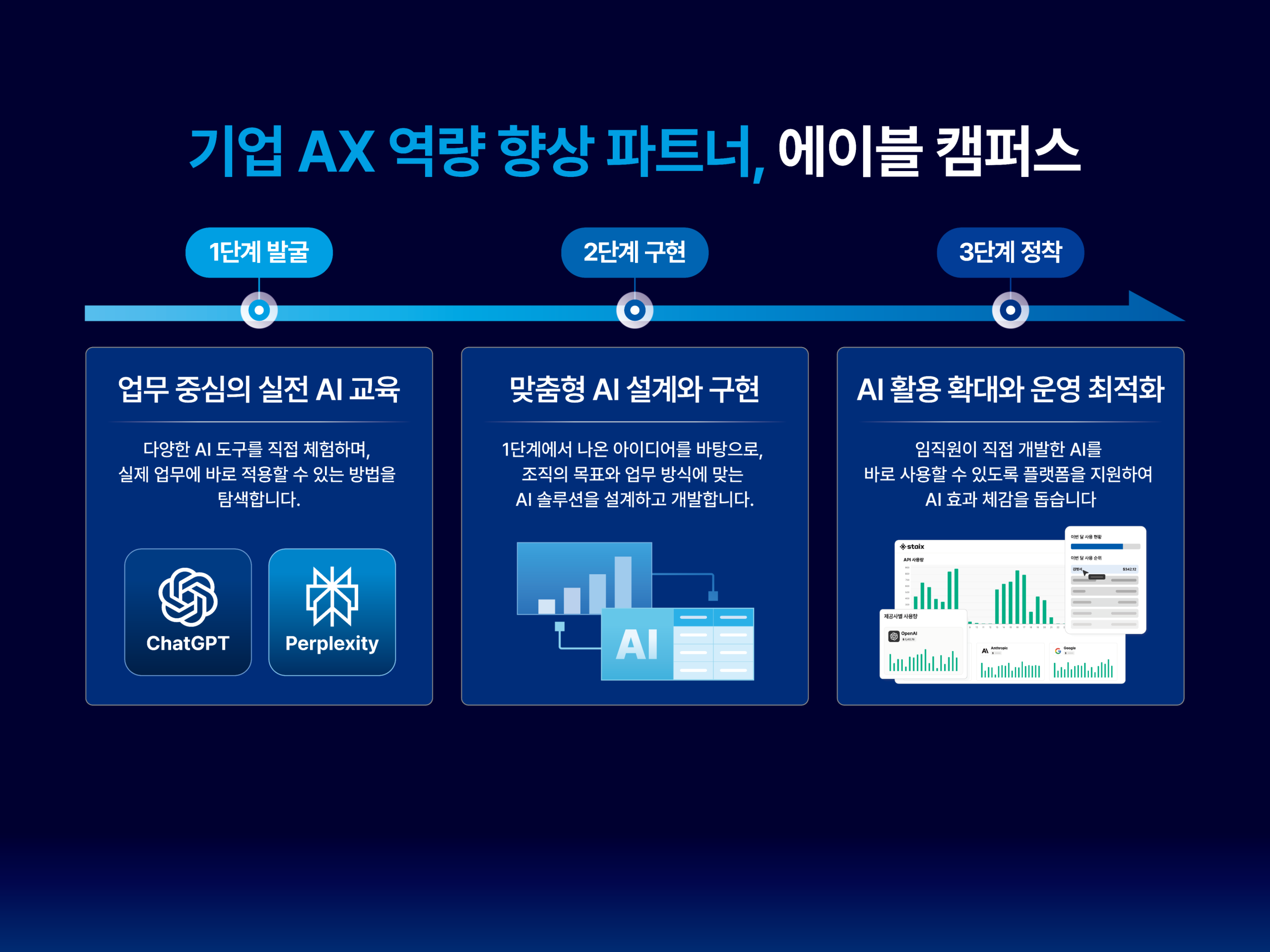 에이블캠퍼스는 기업의 AI 인재 육성을 지원하는 전문 교육 브랜드입니다. 단순한 툴 활용법을 넘어, 직원들이 스스로 업무에 필요한 AI 에이전트를 설계하고 개발할 수 있도록 실습 중심의 교육을 제공합니다. 이를 통해 조직은 직원 주도형 AI 활용 역량을 확보하고, 교육 산출물을 기반으로 성과를 가시화할 수 있습니다. 또한 에이블캠퍼스는 렛서의 AI 운영관리 플랫폼 ‘스테이엑스(Staix)’와 연계되어 교육 효과가 조직 전반으로 확산되도록 지원합니다. 우리는 단발성 교육이 아닌, 지속 가능한 AI 내재화를 목표로 커리큘럼과 운영관리 체계를 함께 제공합니다. 에이블캠퍼스는 기업이 데이터 기반의 업무 혁신을 실현하고, 실질적인 AI 성과를 창출할 수 있도록 신뢰할 수 있는 파트너로 자리매김하고 있습니다.