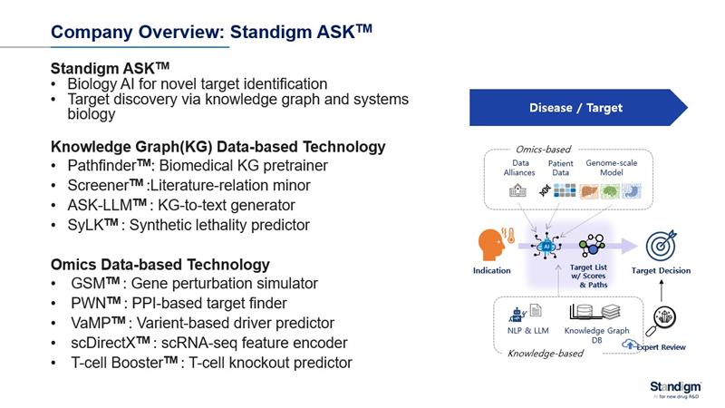 Standigm ASK™ focuses on AI-driven drug target identification, integrating knowledge-based and omics-based technologies.