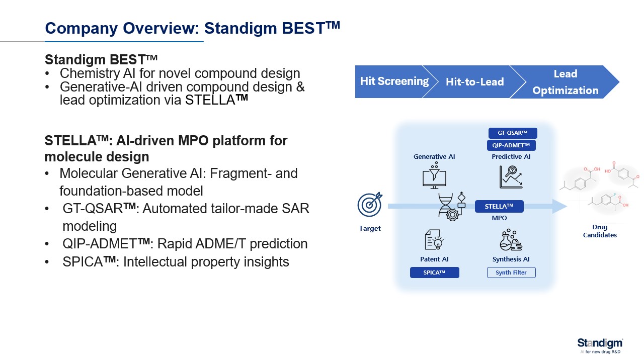 Standigm BEST™ accelerates hit-to-lead and lead-to-preclinical candidate selection with AI-powered drug design and optimization, combining generative AI, predictive modeling, and automation to streamline drug design and optimization, combining generative AI, predictive modeling, and automation to streamline drug discovery process.