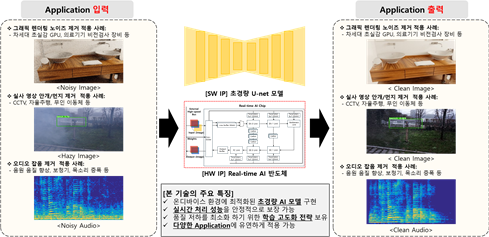 오디오 잡음 제거 기반 Audio Speech Enhancement는 잡음·잔향을 억제해 음질을 높이며 보청기 등 보조기기에 적용할 수 있다. AI 신경망은 경량화된 이미지 디노이징 아키텍처를 음성용으로 변형해, 원래 9채널 입력을 2채널로 축소해 처리한다.