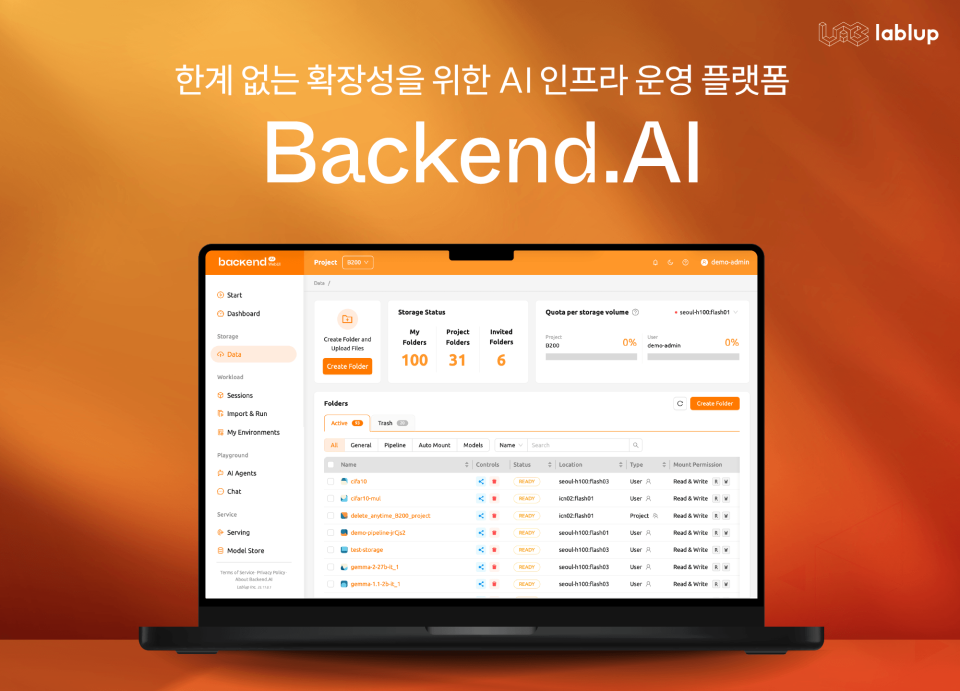 래블업은 ‘Make AI Accessible’을 모토로 머신러닝 플랫폼과 솔루션을 제공하는 회사입니다. 래블업은 과학과 공학 연구 과정을 공유할 때 생겨나는 다양한 문제를 표준화된 플랫폼을 통해 해결하고, 연구 및 서비스의 모든 과정을 자동화하기 위해 노력하고 있습니다. 래블업은 이를 실현하는 Backend.AI를 개발, 서비스하고 있습니다. 하이퍼스케일 AI 플랫폼인 Backend.AI는 소규모 AI 모델부터 초거대 언어 모델까지 다양한 AI 모델을 개발하고 서비스하는 모든 과정의 어려움을 줄여줍니다.