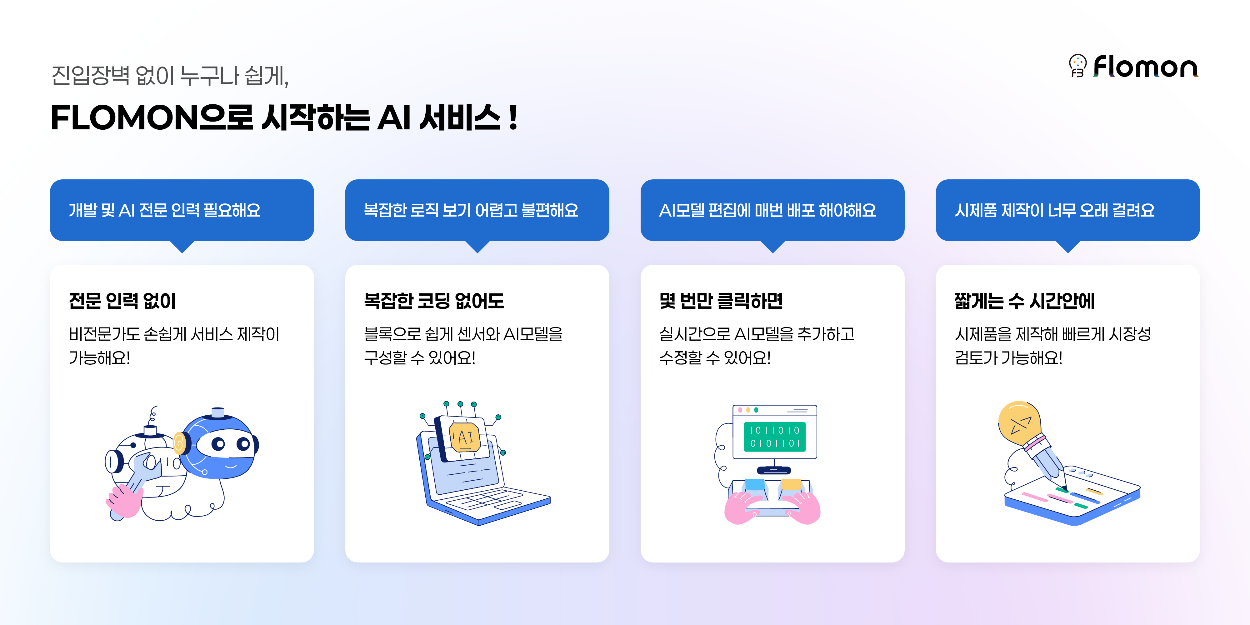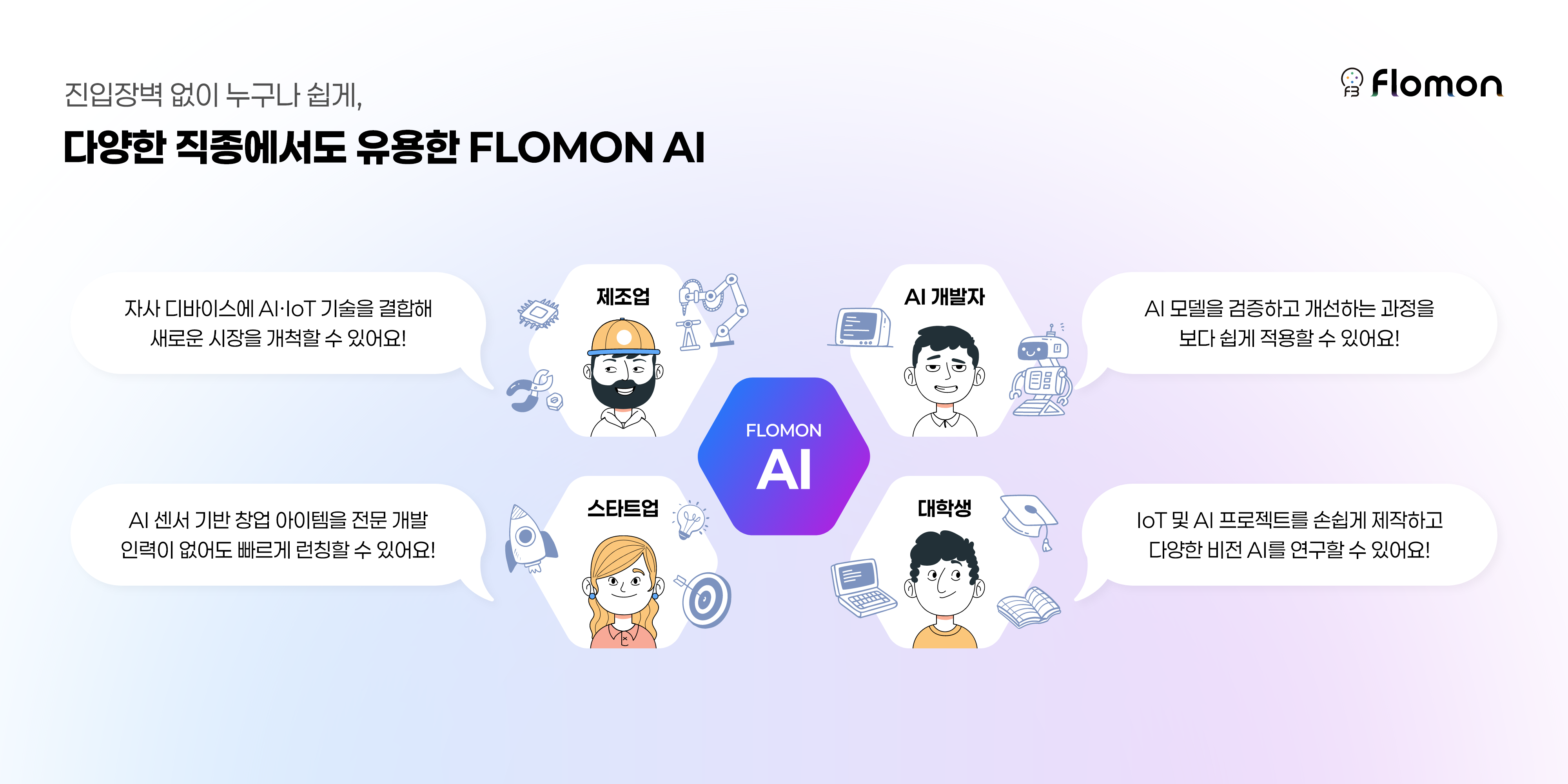 - Flomon은 다양한 산업 현장(시설물 안전, 원격 전원 관리, 스마트 농업 등)에서 발생하는 데이터를 실시간으로 수집·가공하고, 내장된 AI 알고리즘을 적용해 위험 예측, 이상 감지, 질병 진단 등 지능형 서비스 구현을 쉽게 할 수 있음