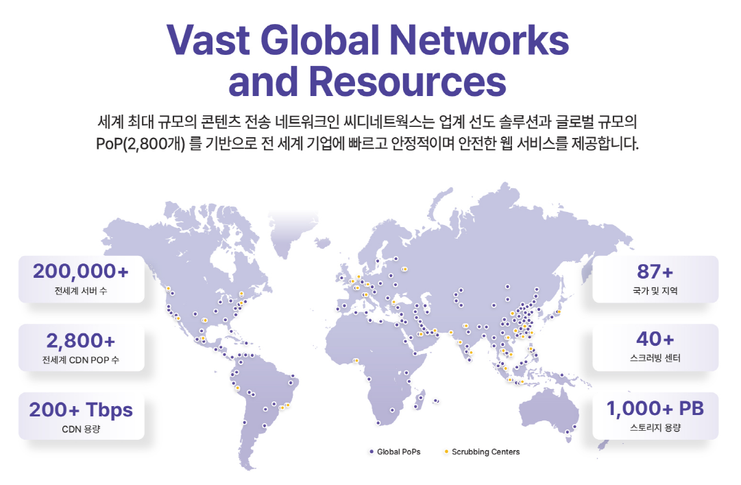 2800개 이상의 글로벌 PoP (Points of Presence)와 20년 이상의 기술 경험을 보유한 씨디네트웍스는 엣지서비스(Edge as a Service)를 통해 가장 빠르고 안전한 디지털 서비스 경험을 제공하고 있다. 제공하는 서비스에는 웹 성능, 미디어 전송, 클라우드 보안, 제로 트러스트 보안 및 코로케이션이 포함되며, 모든 서비스는 다양한 비즈니스 환경에 큰 변화를 만들어가고 있다.