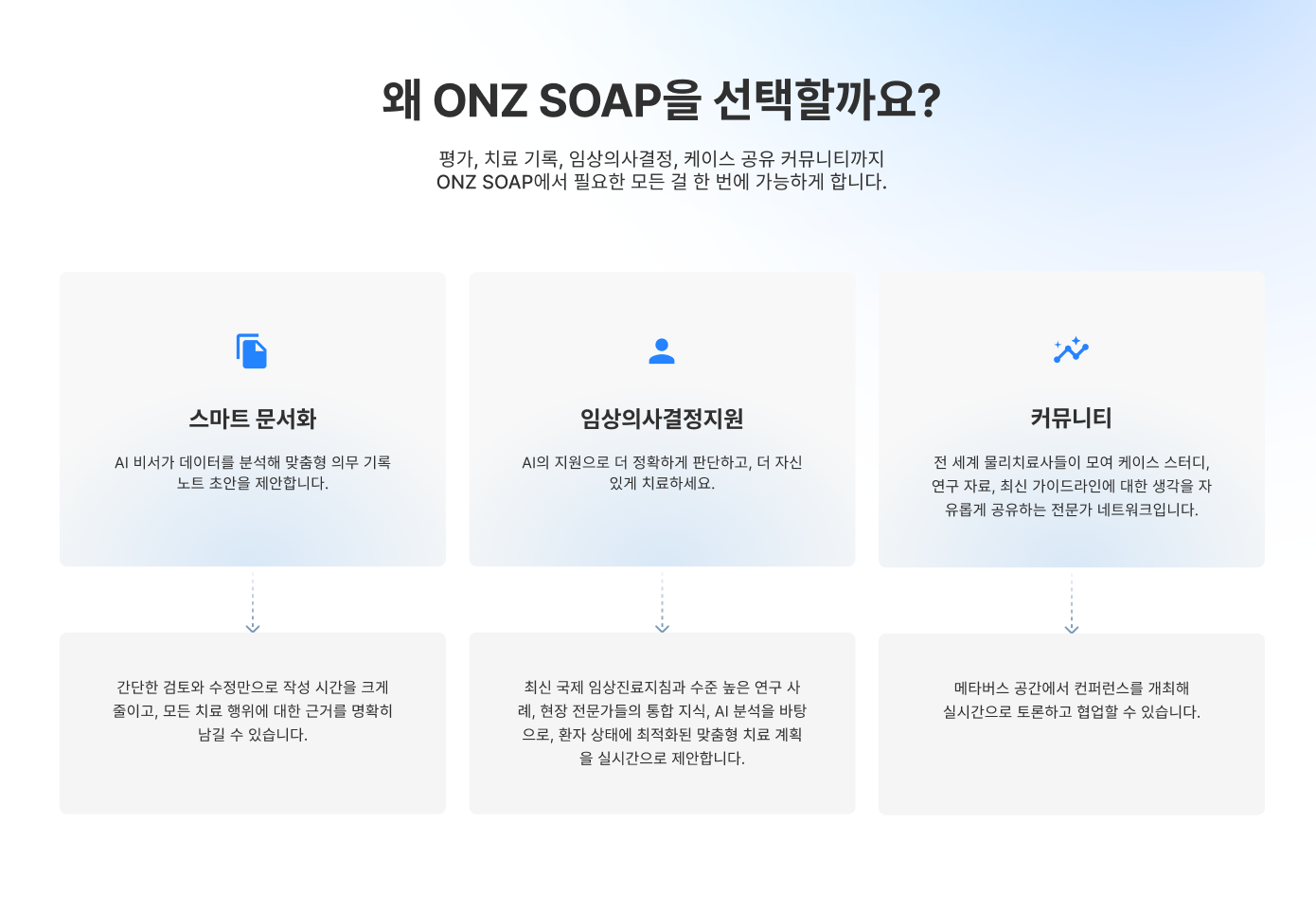 주요 기능은 AI 기반 임상의사결정 지원과 의무기록 자동 생성 서비스입니다. 본 시스템 ONZSOAP (온즈솝)은 주관적, 객관적 기록 및 챗봇과의 대화를 통해 환자의 증상과 상태를 평가하고, 데이터 기반의 임상진료지침을 바탕으로 적절한 치료 계획을 제안합니다. 동시에 수집된 정보는 의무기록 형식에 맞춰 자동으로 정리되어, 주관적, 객관적 정보와 평가 및 치료 계획까지 사례 보고 형식으로 간편하고 정확하게 문서화할 수 있습니다.