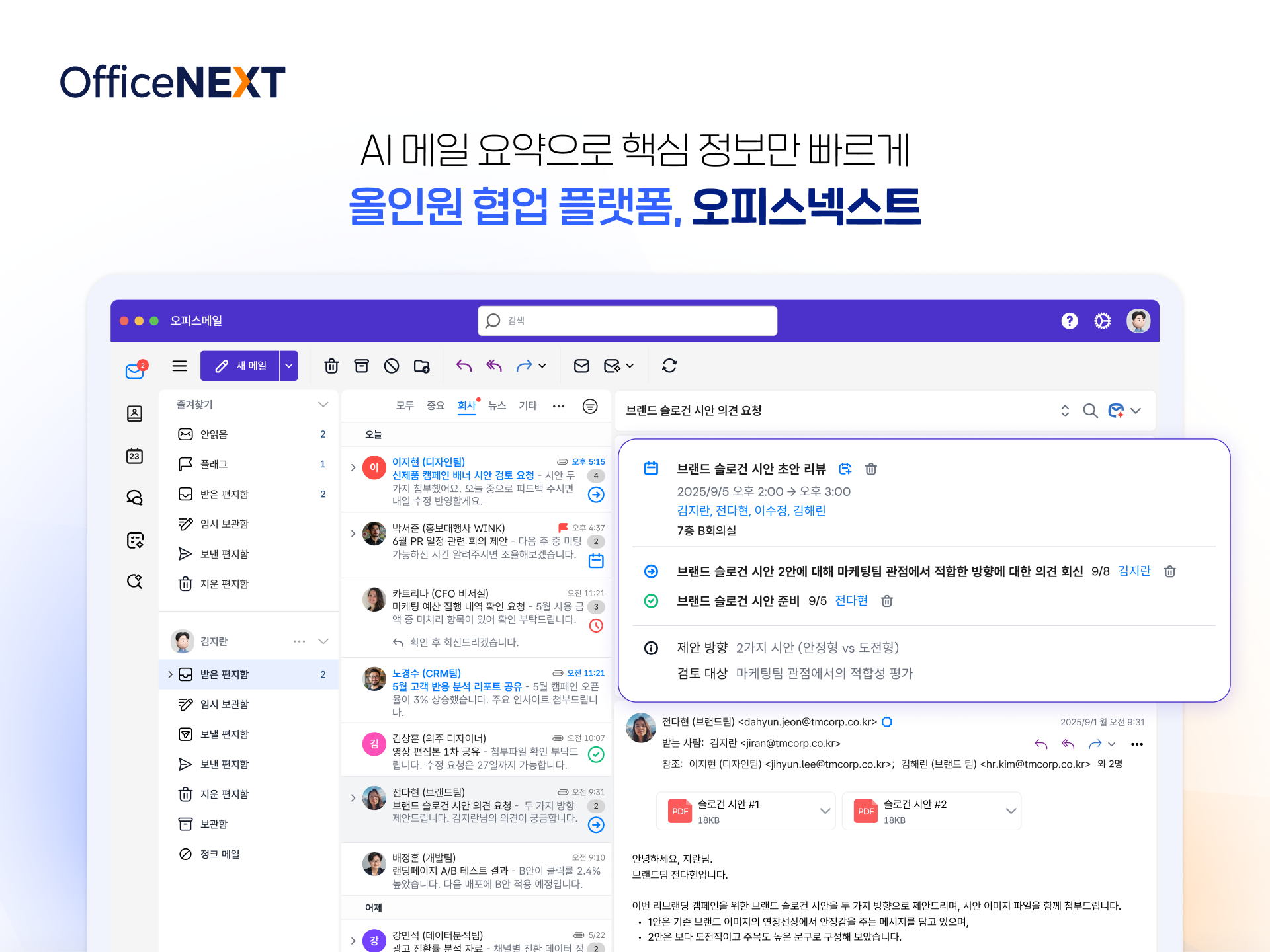 메신저, 노트, 메일, 보안 모니터링 등 핵심 업무 도구를 하나의 조직도 기반으로 통합 제공해 비효율을 줄이고, 다양한 AI 기능을 통해 메신저·노트·메일 간의 업무 맥락을 자연스럽게 이어주는 안전하고 똑똑한 협업 환경을 구현합니다. 오피스넥스트로 효율적인 협업, 안전한 데이터 관리, 그리고 지속 가능한 업무 시스템을 경험해 보세요.