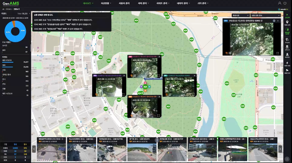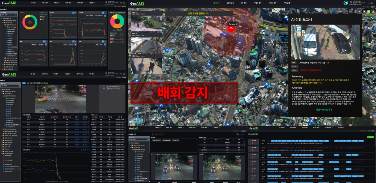 인텔리빅스가 독자 개발한 'Gen AMS'는 생성형 AI 기반의 차세대 지능형 영상 관제 솔루션입니다. 기존의 단순 영상 관제 시스템(VMS)을 넘어, 화재, 도난, 쓰러짐, 교통사고 등 다양한 사건의 발생을 실시간으로 탐지합니다. 나아가 Vision Language Model(VLM) 기술을 통해 수집된 영상의 의미와 맥락까지 자연어로 분석하여, 관제사가 상황을 직관적으로 파악하고 신속하게 대응할 수 있도록 지원합니다. 또한, 실시간 이벤트 감지 및 자동 보고서 생성 기능은 관제 업무의 효율을 극대화합니다. 영상 데이터를 기반으로 잠재적 위험 요소를 예측함으로써 인적 오류와 물리적·경제적 비용을 최소화하며 공공, 산업, 교통, 국방 등 다양한 분야에서 24시간 우리 사회의 안전을 지킵니다.
